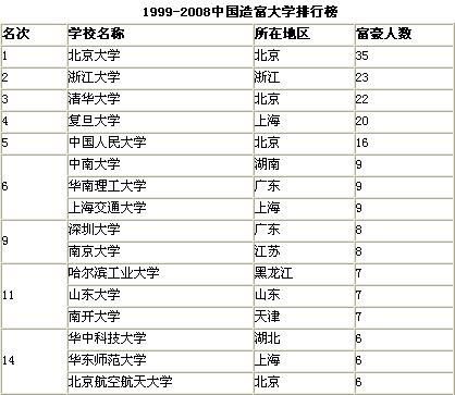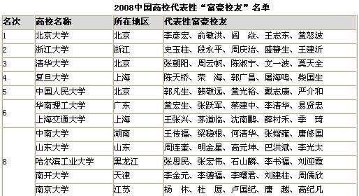“中国校友会网大学评价课题组”对1999-2008年中国富豪榜上榜的1500多名亿万富豪的毕业院校展开调查统计。结果发现,上榜的1500多名亿万富豪中约有30%的人接受过高等教育,毕业于我国140多所高等院校,富豪中少部分具有海外留学经历。