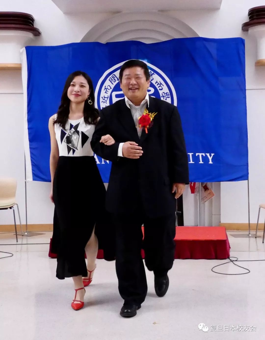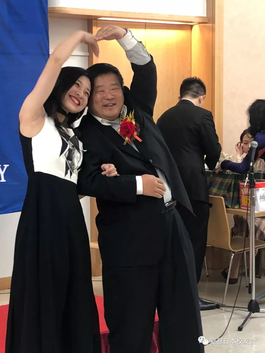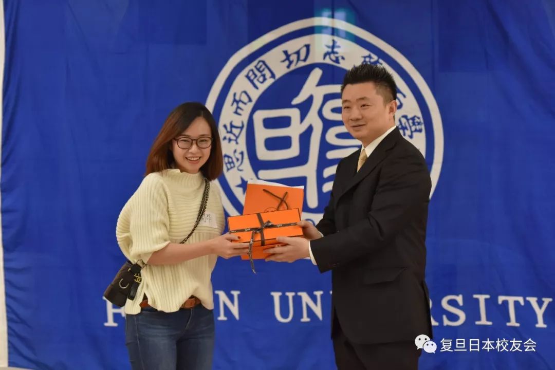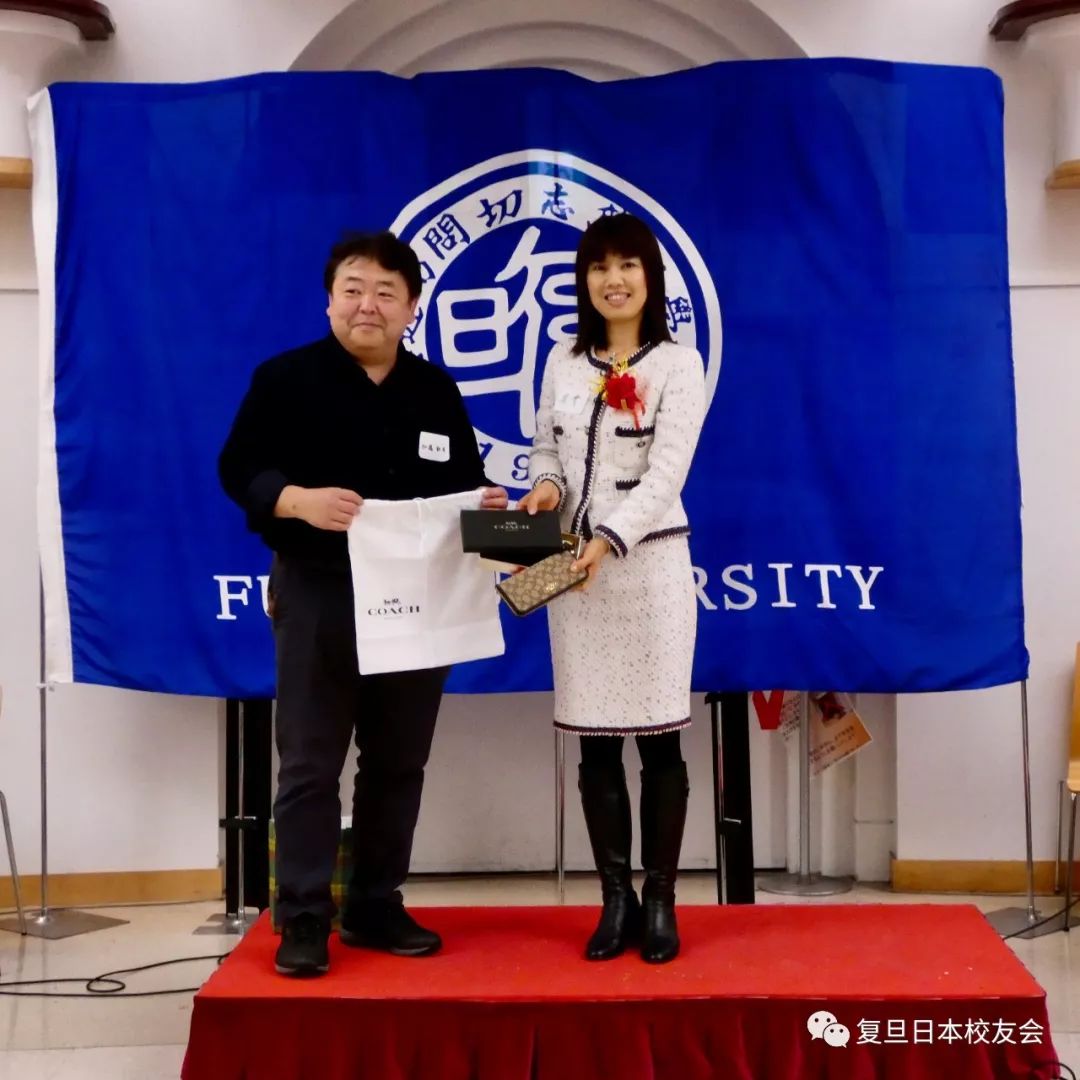 与日本传统意义上以聚餐为主的忘年会不同,本次忘年会在品鉴各类美食之余,还组织了舞蹈、走秀、抽奖、互动游戏等多个环节,整场晚会始终在欢快、自由、亲切的氛围中进行。 本次忘年会由在日校友罗重黎小姐和陈俊萌先生共同主持。北京大学日本校友会会长姚力先生、北京大学日本校友会理事长李燃先生、华东师范大学日本校友会秘书长何红云女士、清华大学日本校友会代表宋秀明先生、东华大学日本校友会会长王菁女士、北京外国语大学日本校友会会长刘岳先生、北京外国语大学日本校友会理事垣浦夕子女士、李迎久女士、朱闻迪女士、上海大学日本校友会副会长兼秘书长许鸣先生、上海大学日本校友会副会长许秀萍女士以及同济大学日本校友会会长张中平先生等友校来宾也应邀出席了本次忘年会。 复旦大学校友会会长唐振尧先生首先致辞。唐振尧会长首先对多年来母校一如既往的支持,校友们的倾心配合与帮助,表达了感激之情,同时对友校嘉宾们的到来表示了诚挚的谢意。唐振尧会长也对过去的一年工作做了总结,复旦大学日本校友会在这最近的一年里举行了新年会、粽横四海端午聚会、赏花赏月中秋聚会、新年滑雪活动和“以国球会校友,于他乡增友谊”乒乓球友谊赛,这些活动在锻炼了身体的同时也增进了校友之间的感情。最后他也希望校友们能踊跃地参与到为校友会服务的浪潮中来,在服务中增进友谊,在奉献中加深交流。
