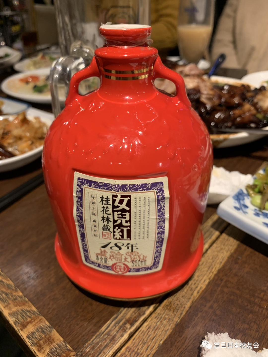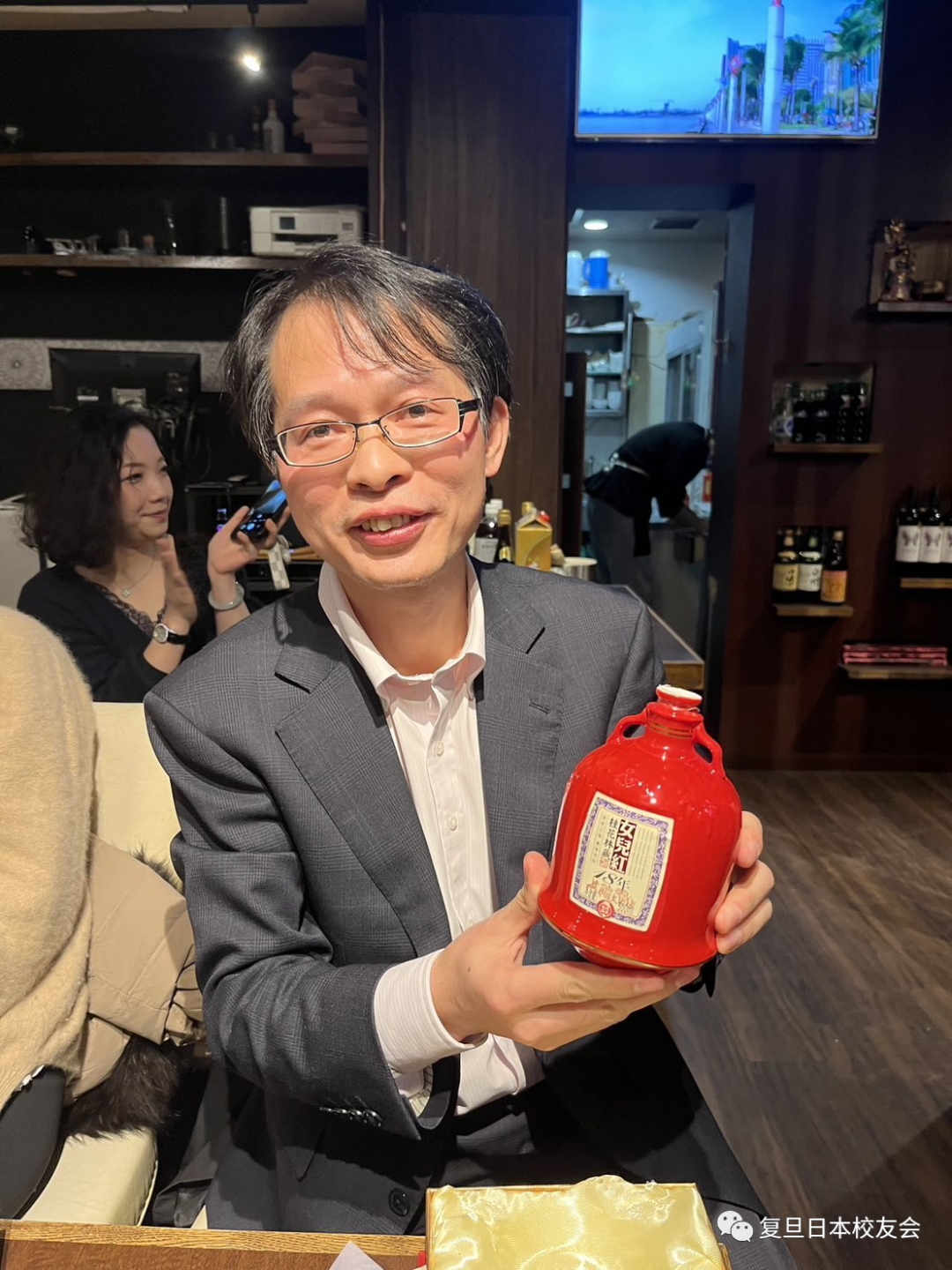 在这里要真心感谢各位为此次活动费心的人员。谢谢复旦日本校友会理事会的组织和安排,才让我们复旦东京校友们能有一个这么难得的平台认识彼此,加深相互间的友谊。夏良根校友还带来了一瓶上好的女儿红和古越龙山黄酒,分享给大家品尝!