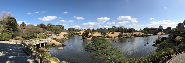 虽说节气名为“雨水”,但当福冈小分队最终抵达熊本、与会长在内的大部队时,熊本的天空格外晴朗。享用过午餐后,我们直奔第一站,水前寺成趣园(水前寺成趣園)。据载,从熊本藩初代藩主细川忠利在1636年(寛永13年)建造了“水前寺御茶屋”之后,历经三代藩主,八十年的时间,最终完成了现在所见的庭园(https://ja.wikipedia.org/wiki/水前寺成趣園)。