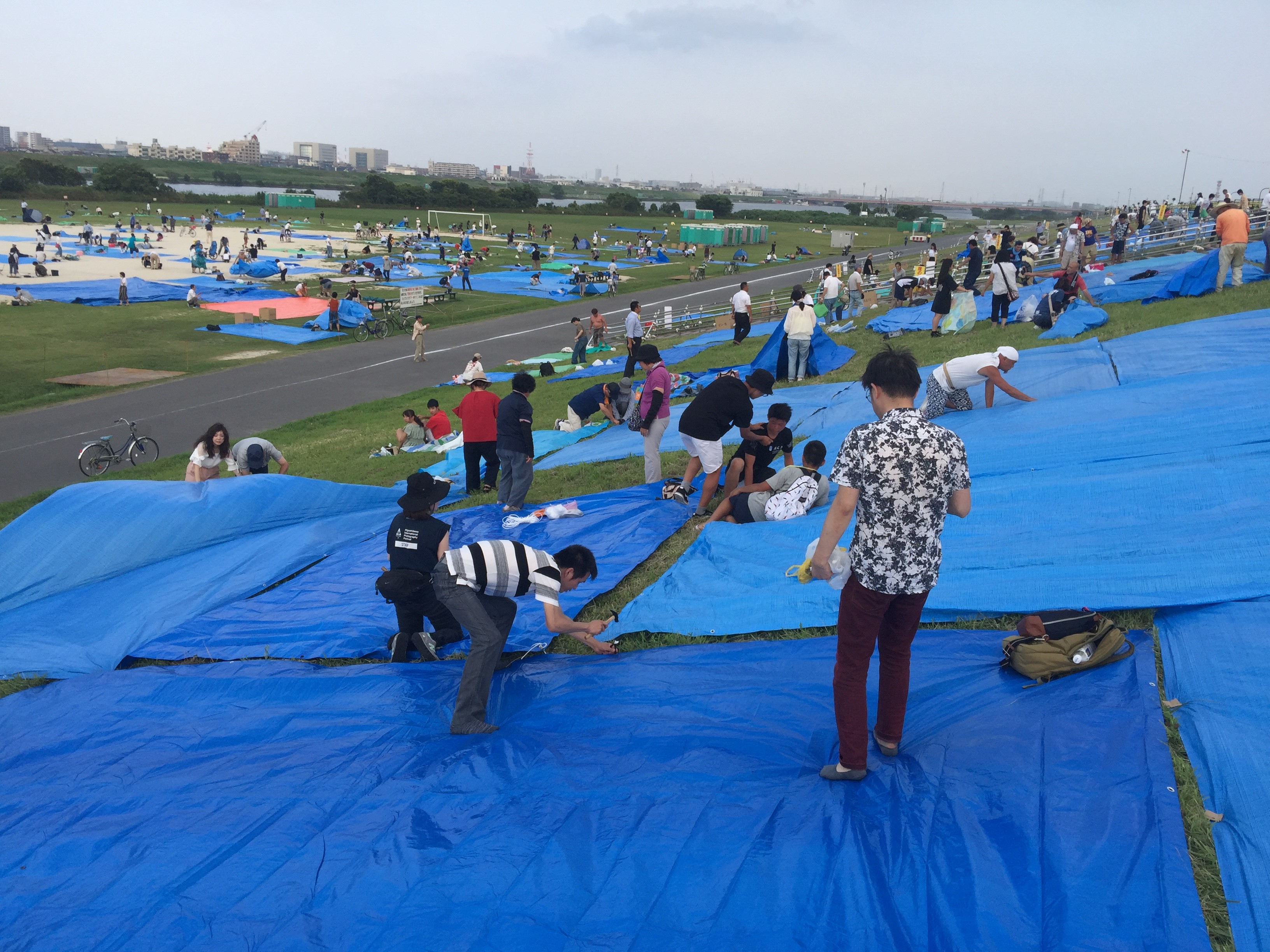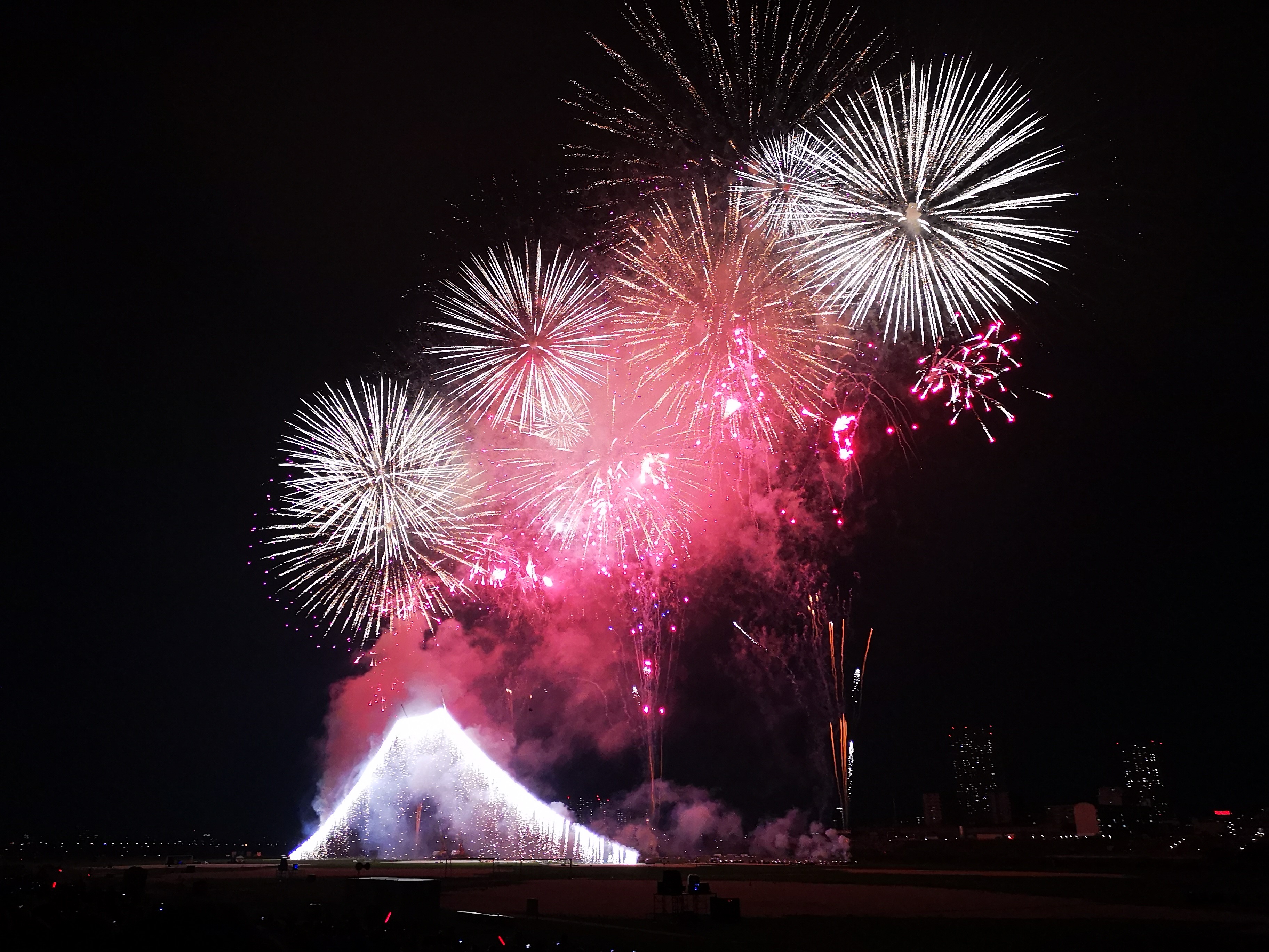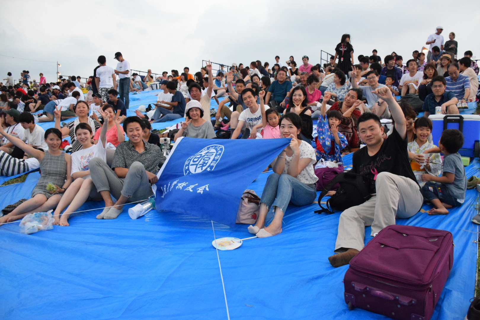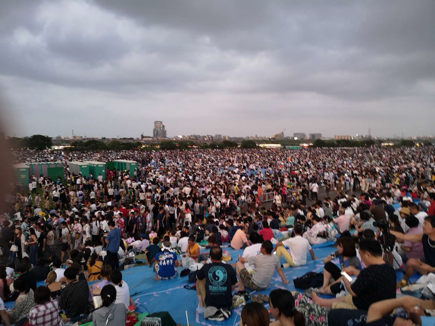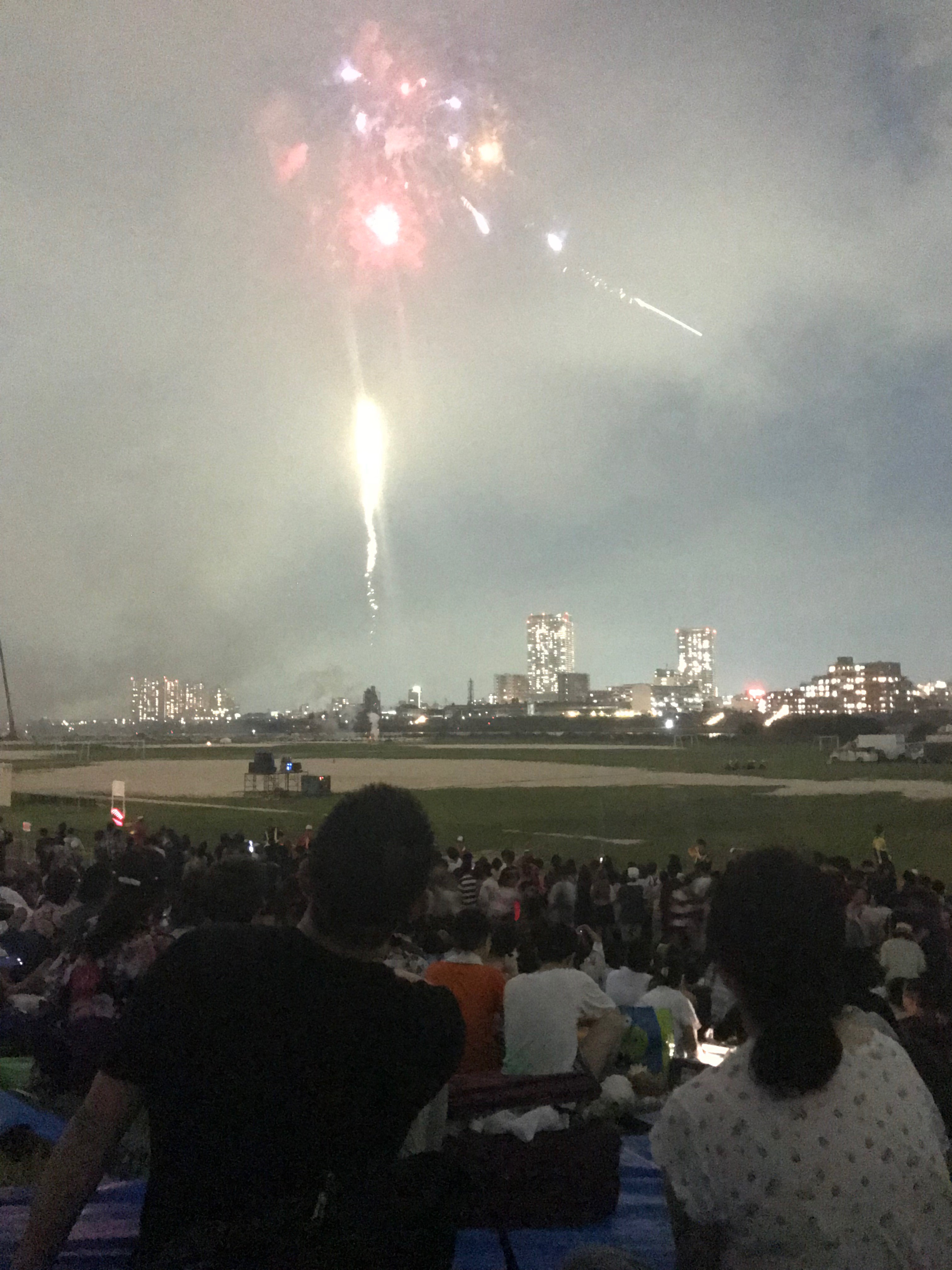 尽兴地欣赏烟火最重要的是什么?Location,Location,Location!!于是先头小分队在前一天8月3日下午冒着体感温度40度的高温出动占位。从两点守候到五点,然后正式开始圈地运动。由于到的还算早,成功抢占视线无遮挡席位。原来打算圈7.2x5.4米两块地的,被一热心富有经验的老伯热辩说服以我们的人数占一块即可。事实证明是绰绰有余。不过最后还是不放心,又抢了快邻接的小飞地,后来却成就了当晚几对临时找座位的小鸳鸯。