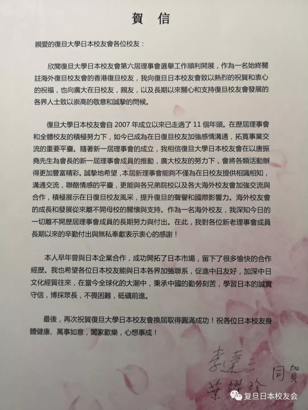 此次忘年会,我们收到了复旦校友、著名慈善家、实业家、爱国人士李达三校友和夫人叶耀珍校友远道而来从香港寄来的贺信。贺信中对日本校友会换届工作的顺利展开致以热烈的祝贺和衷心的祝福,也向广大在日校友亲友,以及长期以来关心和支持复旦校友会发展的各界人士致以崇高的敬意和诚挚的问候。